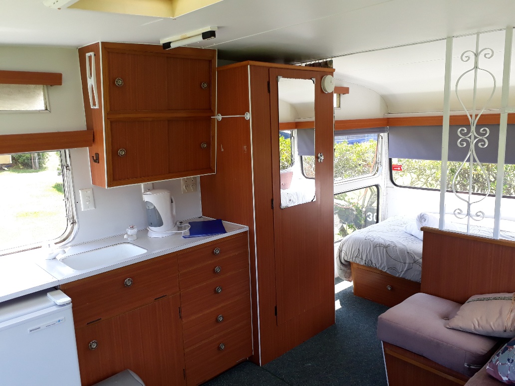 Plates, cups, utensils, cooking equipment, fridge, microwave, kettle and toaster are included. Guests use the shared camp facilities – kitchen, toilets and showers.