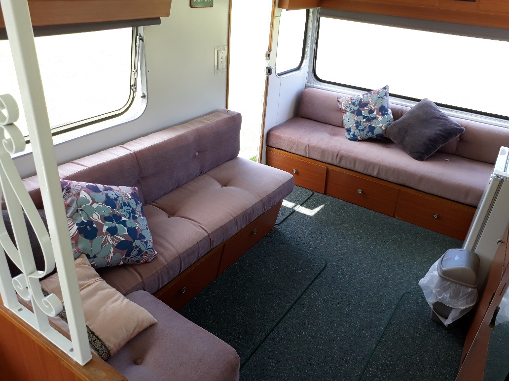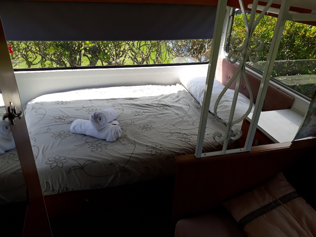 Includes a fixed (small) double bed, the option of a fold out single bed and use of the bench seat as a (narrow) single bed. Bedding and towels included.
