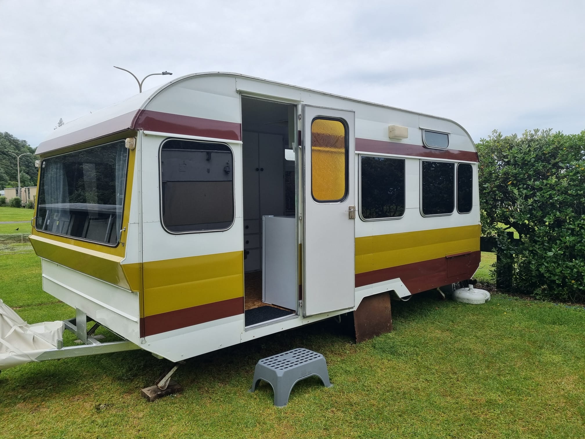 Plates, cups, utensils, cooking equipment, fridge, kettle and toaster are included. Guests use the shared camp facilities – kitchen, TV lounge, toilets and showers.