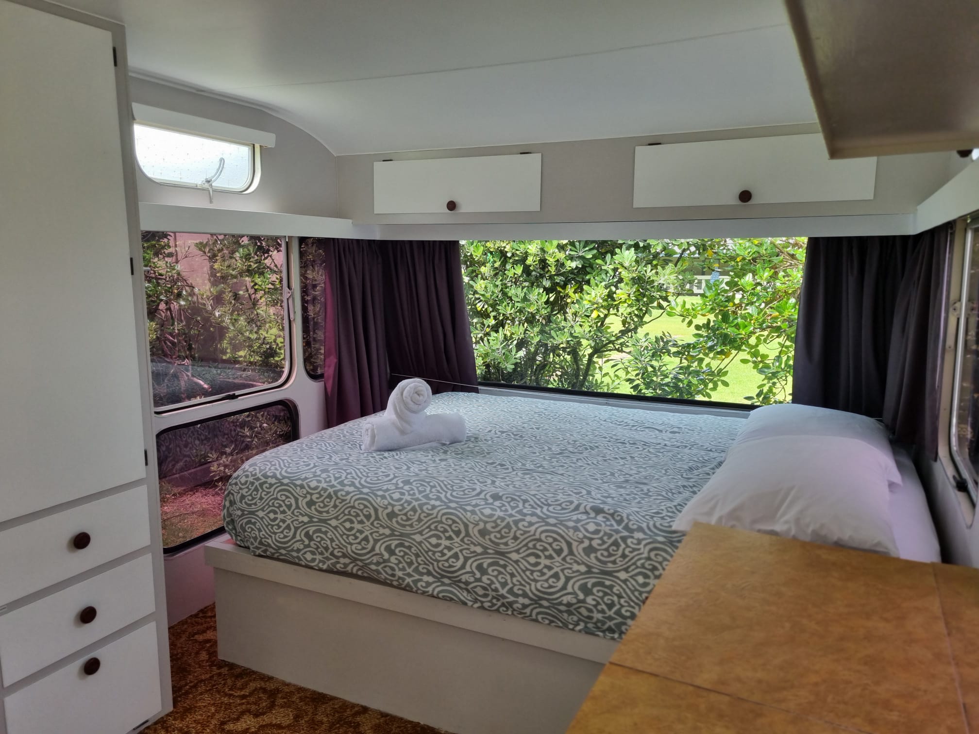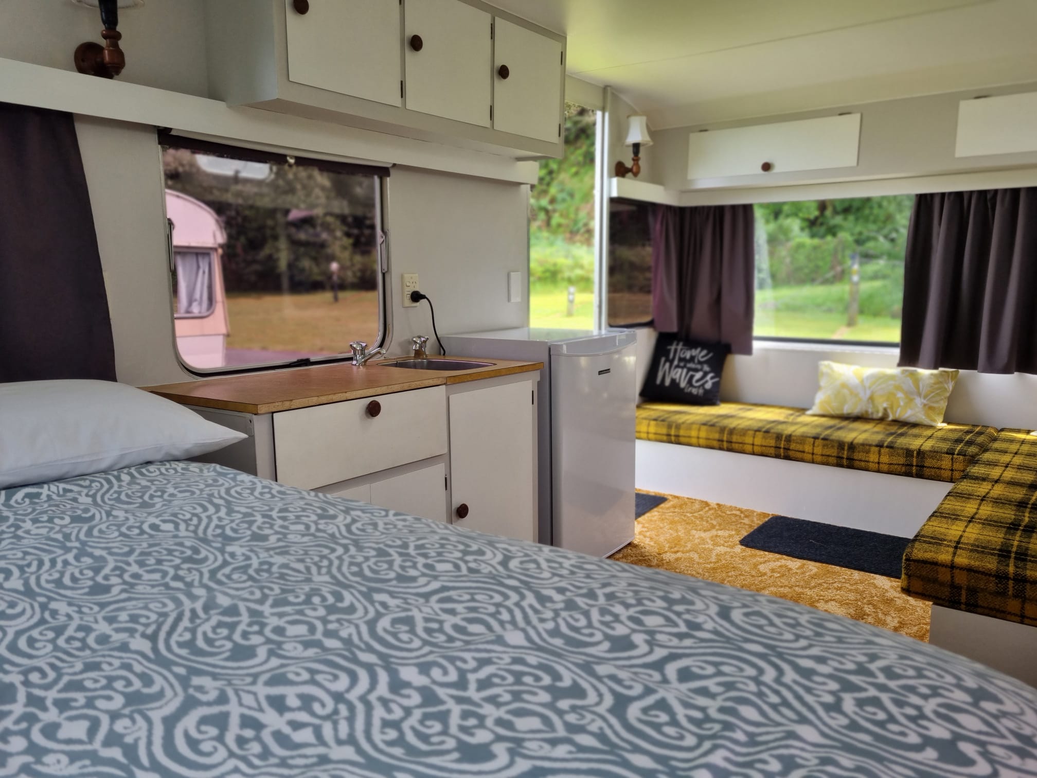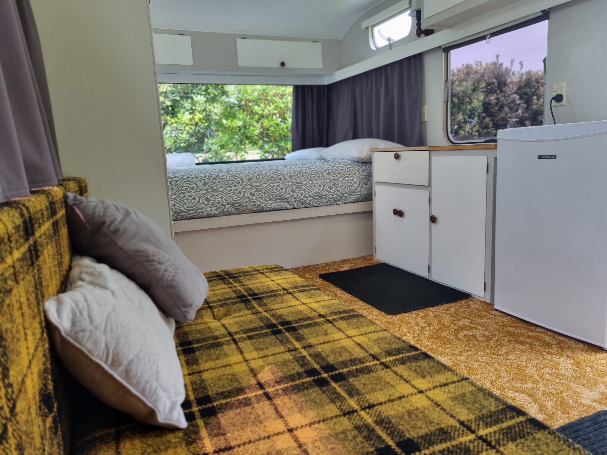 Our Venturer (1970s) Caravan includes a fixed double bed (bedding and towels included) and the option of using the bench seats for small children (bedding not included - can be hired - book in advance).