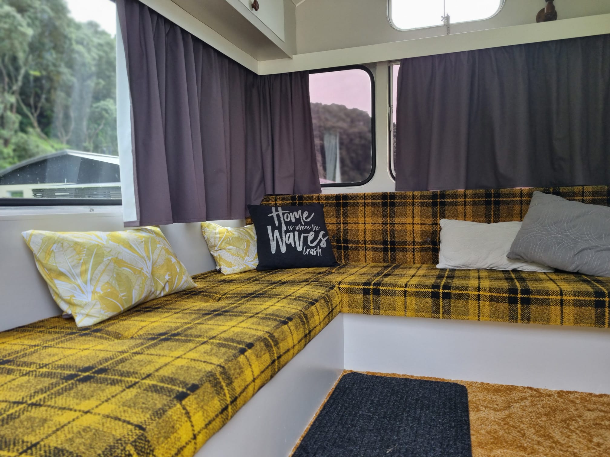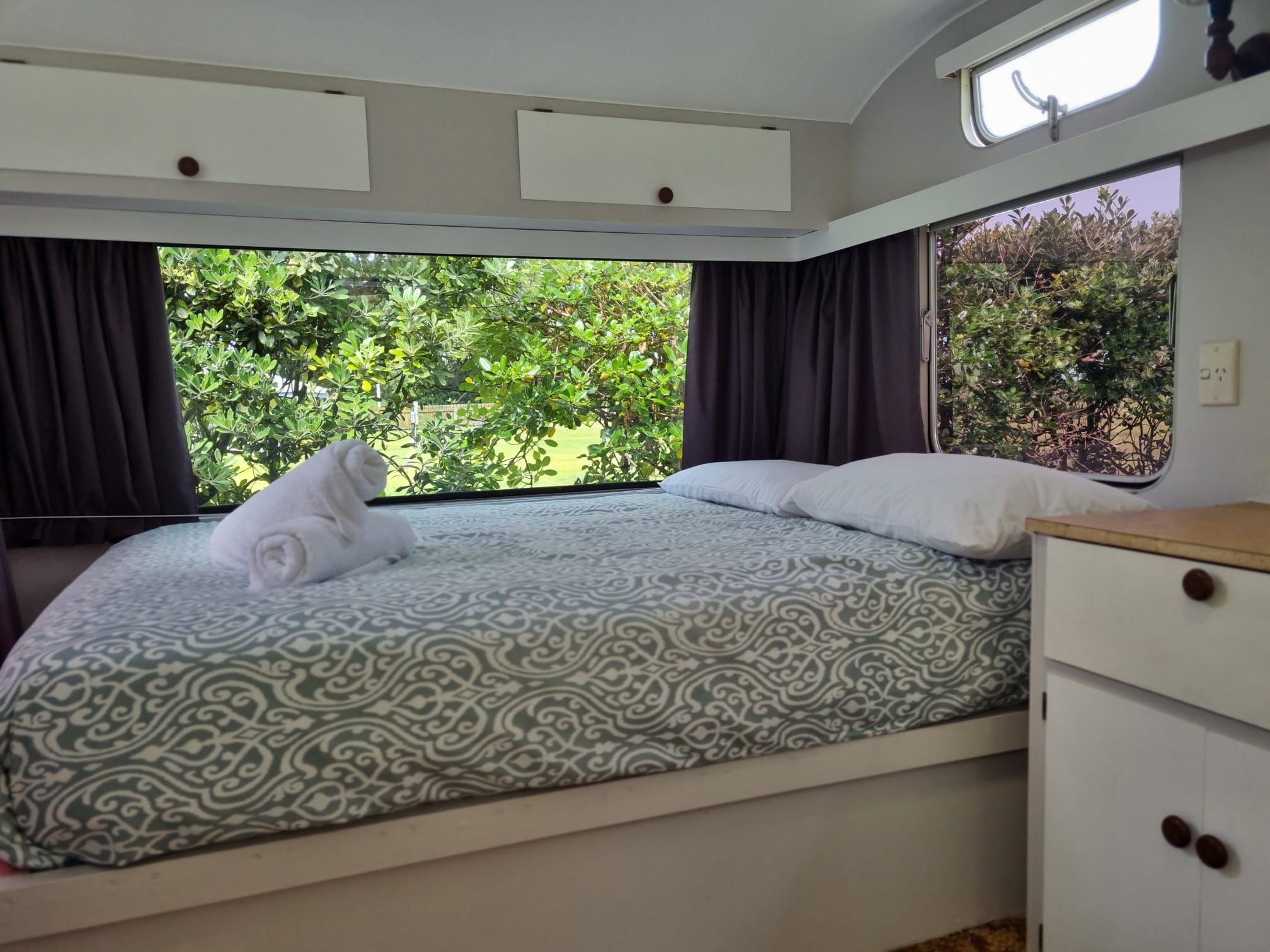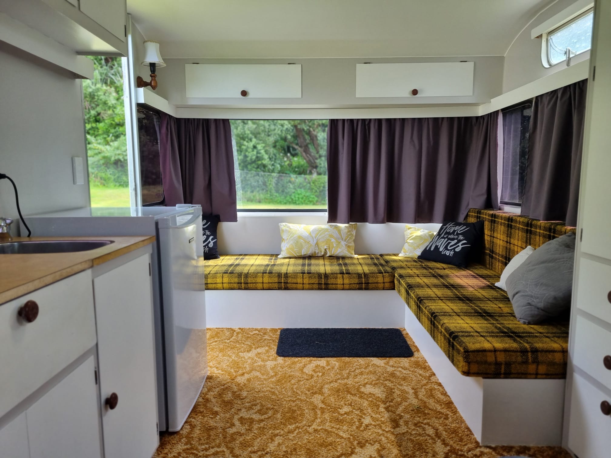 Our Venturer (1970s) Caravan includes a fixed double bed (bedding and towels included) and the option of using the bench seats for small children (bedding not included - can be hired - book in advance).